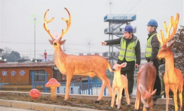 圖為園區(qū)工作人員在對元宵燈會的用電線路進行安全隱患排查和彩燈調試。